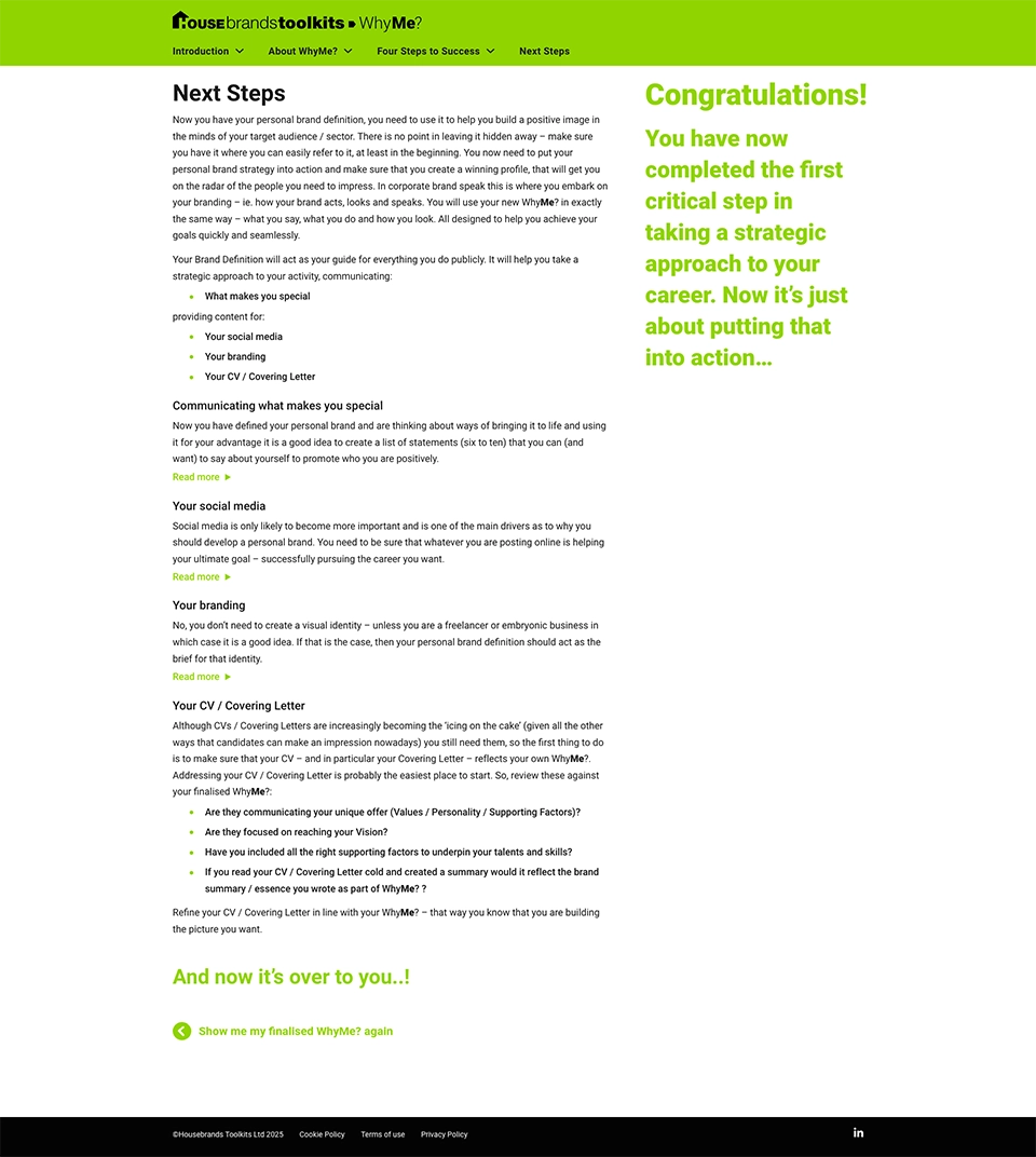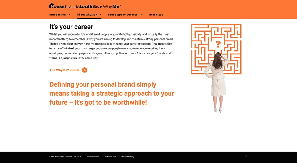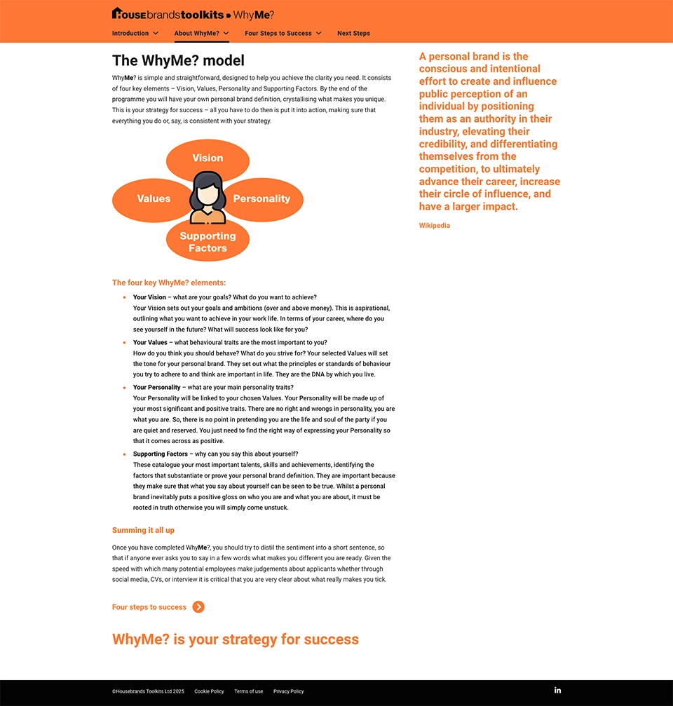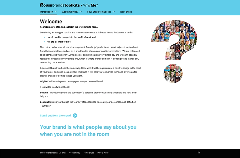 WhyMe? is the new personal brand development toolkit from brand experts Housebrands. It guides you through the 4 steps needed to create your personal brand definition, explaining exactly what you need to do and when, providing detailed, clear instructions, tips and examples.