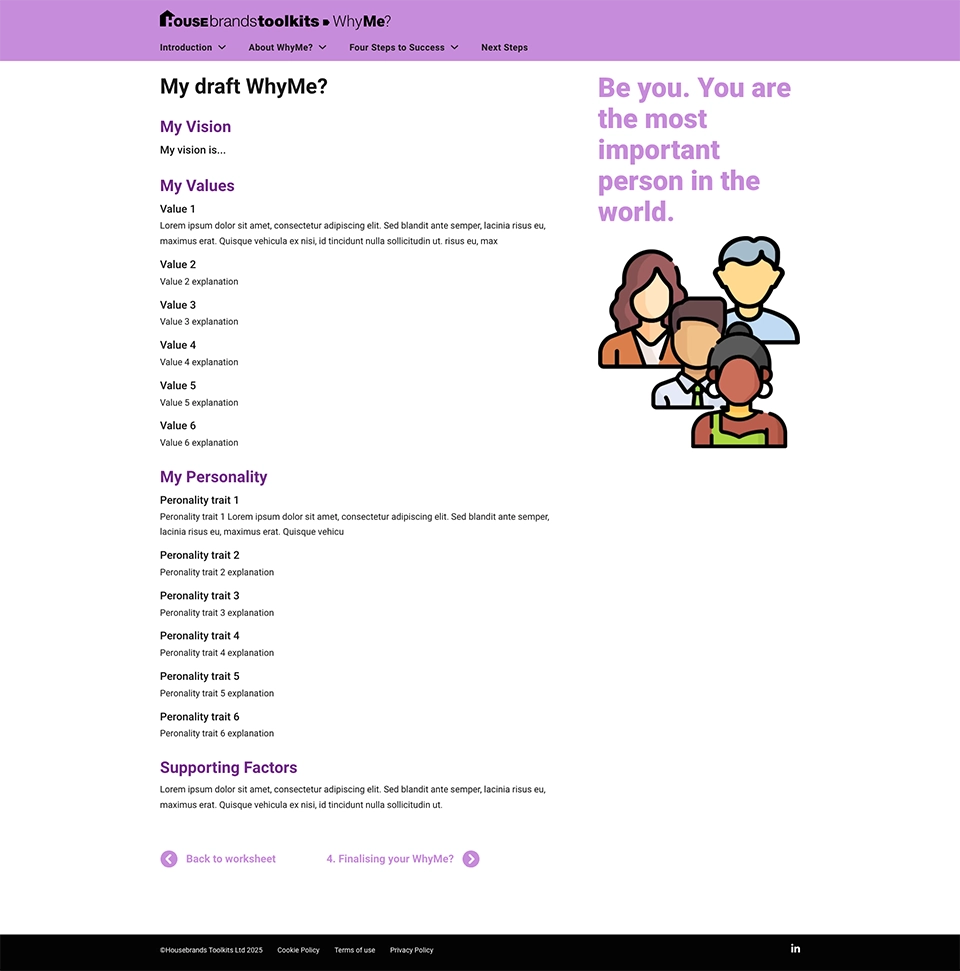 Of course, you could create your own programme by searching the web, reading lots of books and articles, attending a myriad of different webinars and personal brand training sessions but the joy of WhyMe? is that all the hard work has been done for you. You simply need to follow the instructions and add in your own personal data when asked.