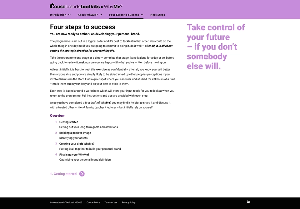WhyMe? is the new personal brand development toolkit from brand experts Housebrands. It guides you through the 4 steps needed to create your personal brand definition, explaining exactly what you need to do and when, providing detailed, clear instructions, tips and examples.
